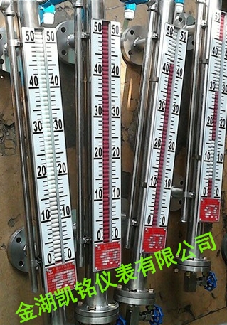 液位計根據(jù)浮力原理,浮子在測量管內(nèi)隨液位的升降而上下移動,浮子內(nèi)的永久磁鋼通過磁耦合作用,驅(qū)動紅、白色翻柱翻轉(zhuǎn)180’液位上升時,翻柱由白色轉(zhuǎn)為紅色,下降時,翻柱由紅色轉(zhuǎn)為白色,從而實現(xiàn)液位的指示。
