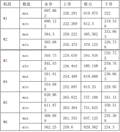 從監(jiān)控系統(tǒng)取出的數(shù)據(jù)有#1-#6 機(jī)組的水導(dǎo)、上導(dǎo)、推力、下導(dǎo)各部軸承油位數(shù)據(jù),分別有機(jī)組檢修后未開機(jī)的油位、機(jī)組運(yùn)行時(shí)的油位、機(jī)組運(yùn)行后停機(jī)的油位三種機(jī)組狀態(tài)下的數(shù)據(jù),計(jì)算分析如下: