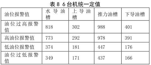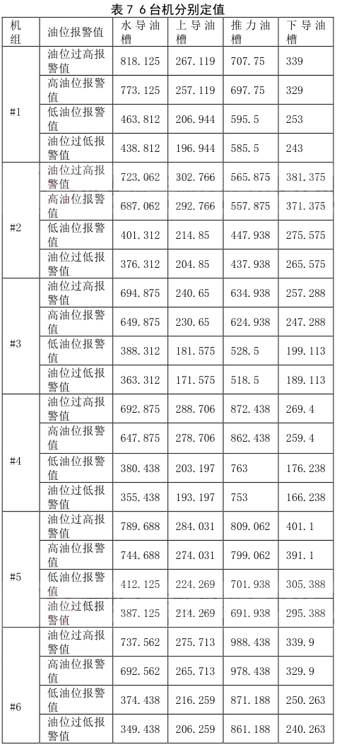 (2)依據(jù)成都勘測設(shè)計(jì)院給的定值要求,建議每臺(tái)機(jī)設(shè)置不同的報(bào)警值。設(shè)置原則:在上導(dǎo)、下導(dǎo)、推力各部油槽油位,結(jié)合機(jī)組運(yùn)行時(shí)的油位*大值上設(shè)置高油位報(bào)警值+20mm、過高油位報(bào)警值 +30mm;*低油位值上低油位報(bào)警值 -20mm、低油位停機(jī)值 -30mm;水導(dǎo)油槽油位:高油位報(bào)警值 +45mm、過高油位報(bào)警值 +90mm;*低油位值上低油位報(bào)警值 -130mm、低油位停機(jī)值 -155mm;躲過報(bào)警值。在此基礎(chǔ)上,真實(shí)的油位只會(huì)下降,設(shè)置值對(duì)油位的運(yùn)行是安全的。分析確定的#1-#6 機(jī)組各油槽油位的動(dòng)態(tài)油位報(bào)警值,即機(jī)組運(yùn)行時(shí)油槽油位的過低、低、高、過高報(bào)警定值如下,可以選擇表 9 的數(shù)據(jù) 6 臺(tái)機(jī)分別進(jìn)行定值,同時(shí)也提供定值表 10 進(jìn)行 6 臺(tái)機(jī)統(tǒng)一進(jìn)行定值。