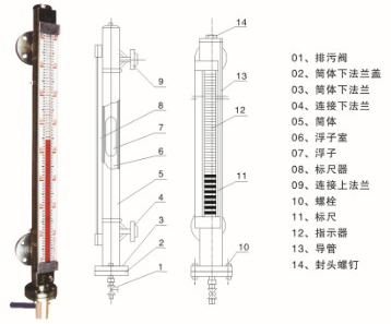 液位計根據(jù)浮力原理,浮子在測量管內(nèi)隨液位的升降而上下移動,浮子內(nèi)的永久磁鋼通過磁耦合作用,驅(qū)動紅、白色翻柱翻轉(zhuǎn)180’液位上升時,翻柱由白色轉(zhuǎn)為紅色,下降時,翻柱由紅色轉(zhuǎn)為白色,從而實現(xiàn)液位的指示。